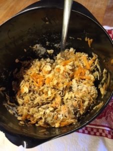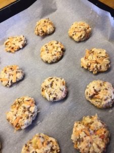 Gör så här: Riv äpplet och moroten på ett rivjärn och lägg i en bunke. Tillsätt resten av ingredienserna och blanda ihop till en deg. Dela upp och forma kakorna till lagom storlek på en ugnsplåt. Jag brukar ta en ungefär en matsked deg, blir cirka 25-30 småkakor. Grädda i 175 grader i cirka 15–18 minuter beroende på ugn. Låt svalna på galler. Är du inte van att baka, så be en vuxen vara med och hjälpa dig.